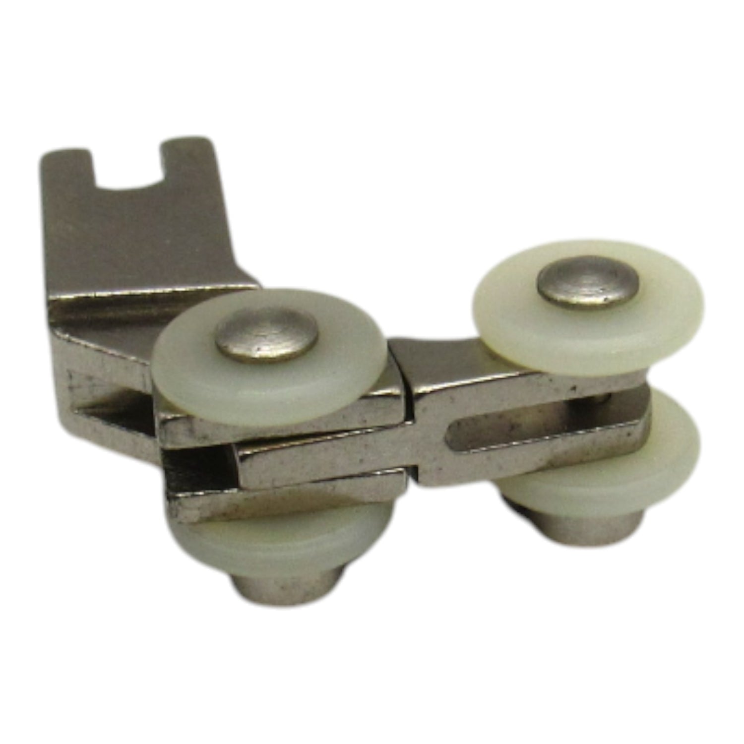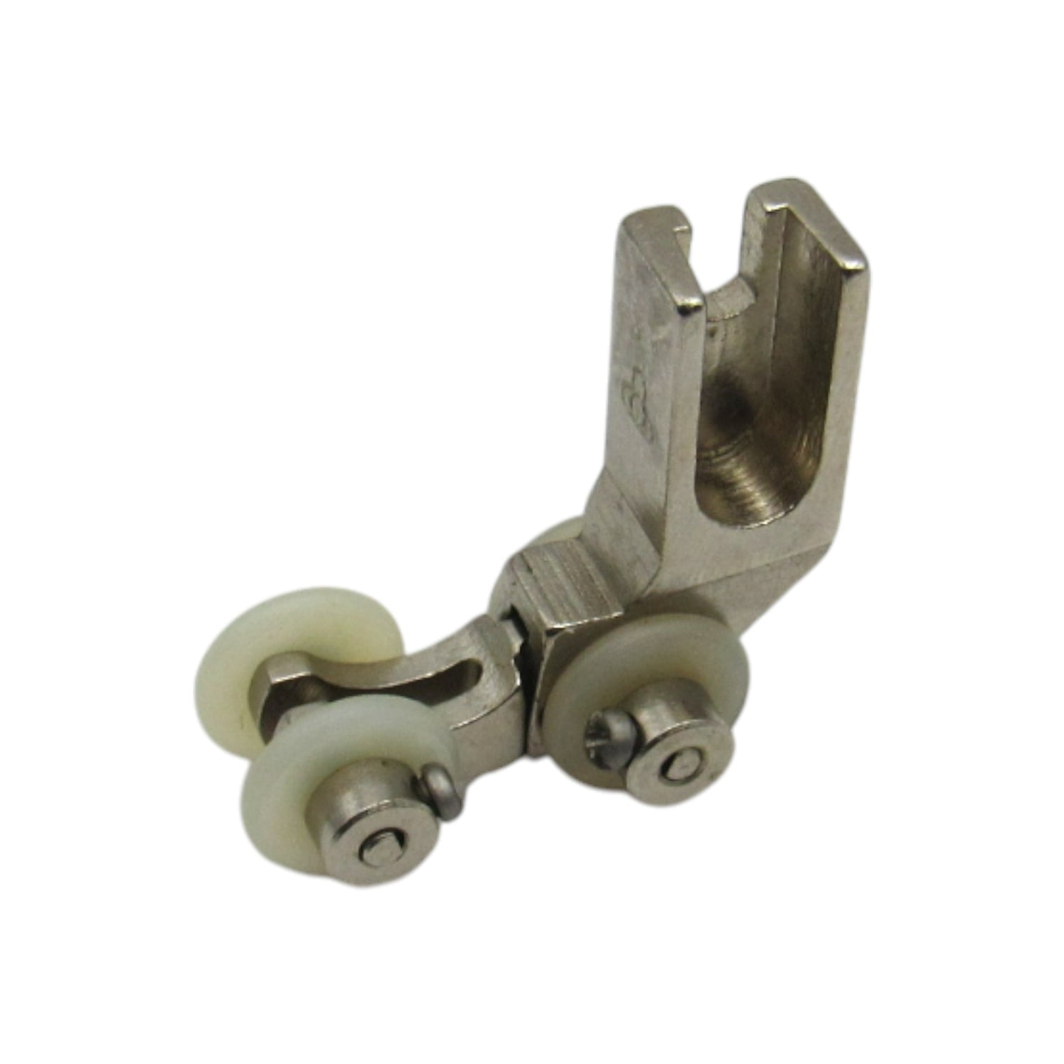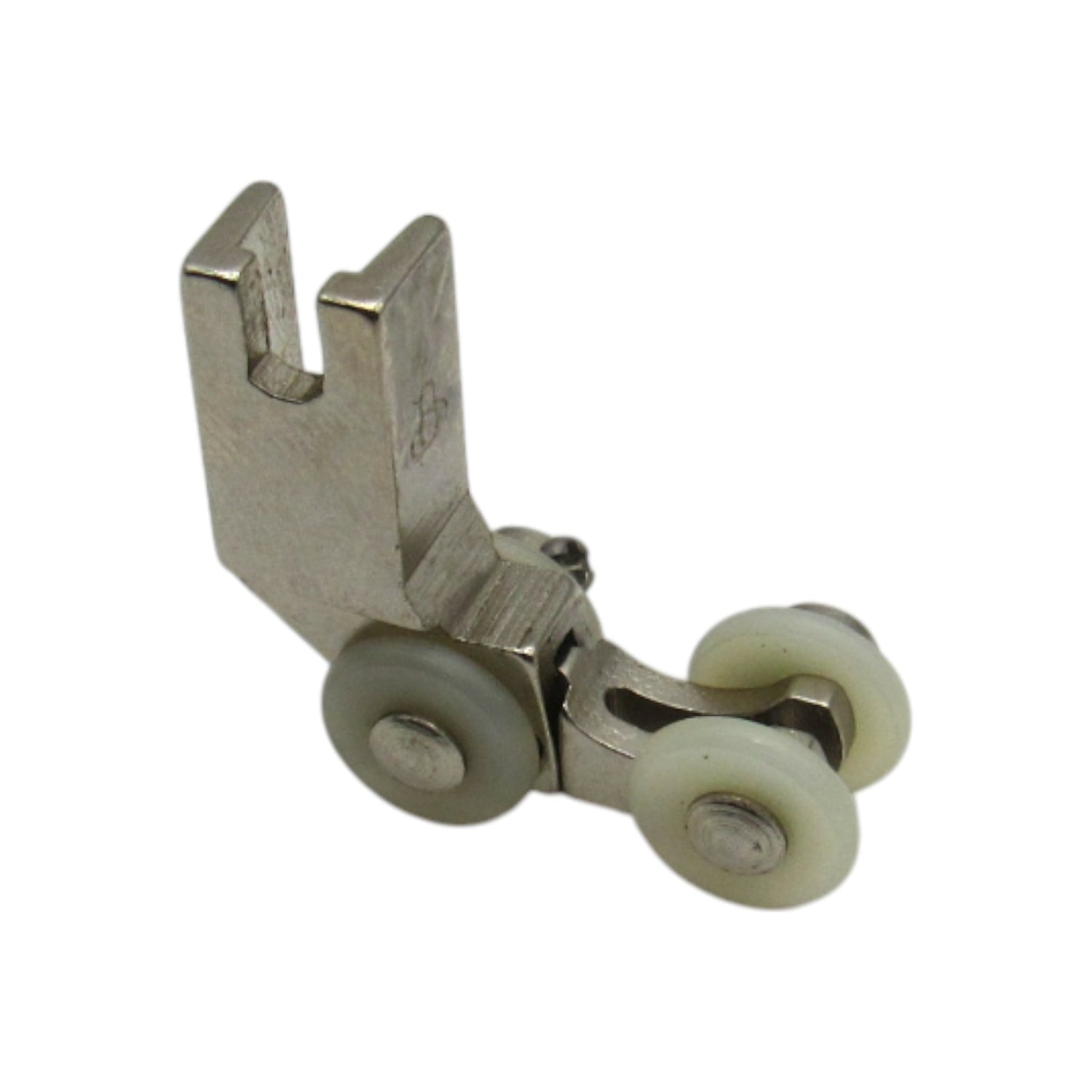 Professional nylon roller foot designed for single needle industrial sewing machines. This specialized presser foot features smooth-rolling nylon wheels that glide effortlessly over difficult fabrics like leather, vinyl, plastic, and other sticky or heavy materials. The roller action prevents fabric from sticking or dragging, ensuring smooth feeding and professional results.