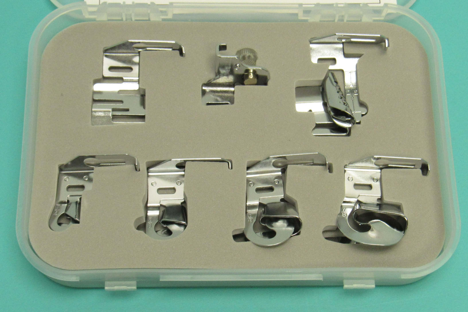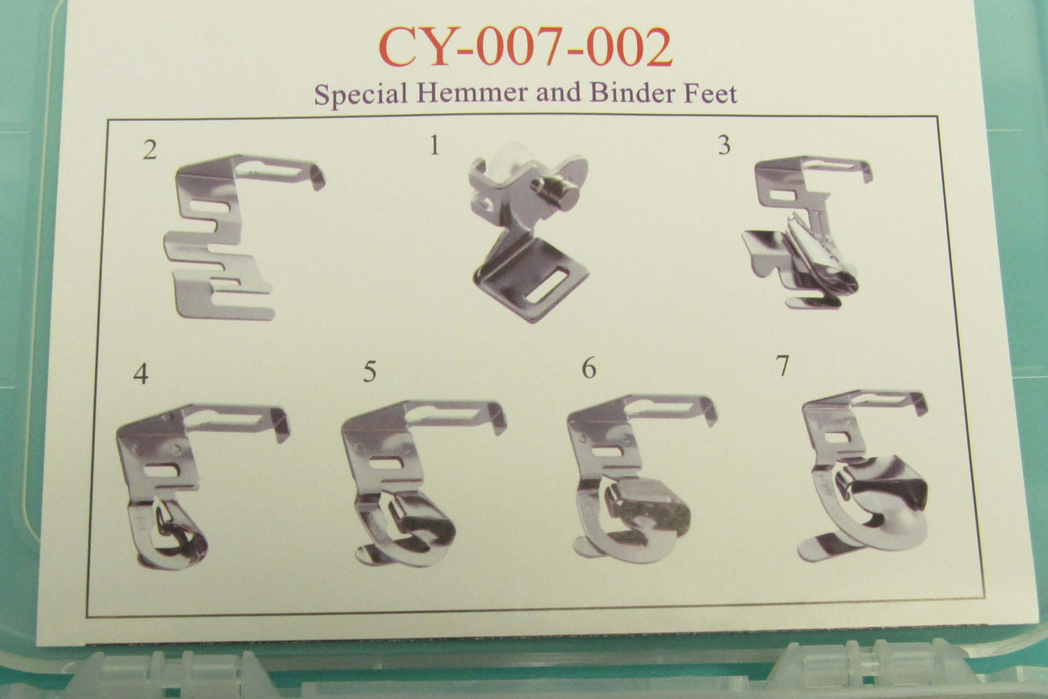 This set includes special hemmer feet and binder, designed to fit most low shank sewing machines. Featuring foam-fitted compartments for 7 items, including a low shank adaptor, edge stitcher, and multiple hemmer sizes (1/4", 3/8", 5/8", and 7/8"). Perfect for achieving precise and professional hemming results.