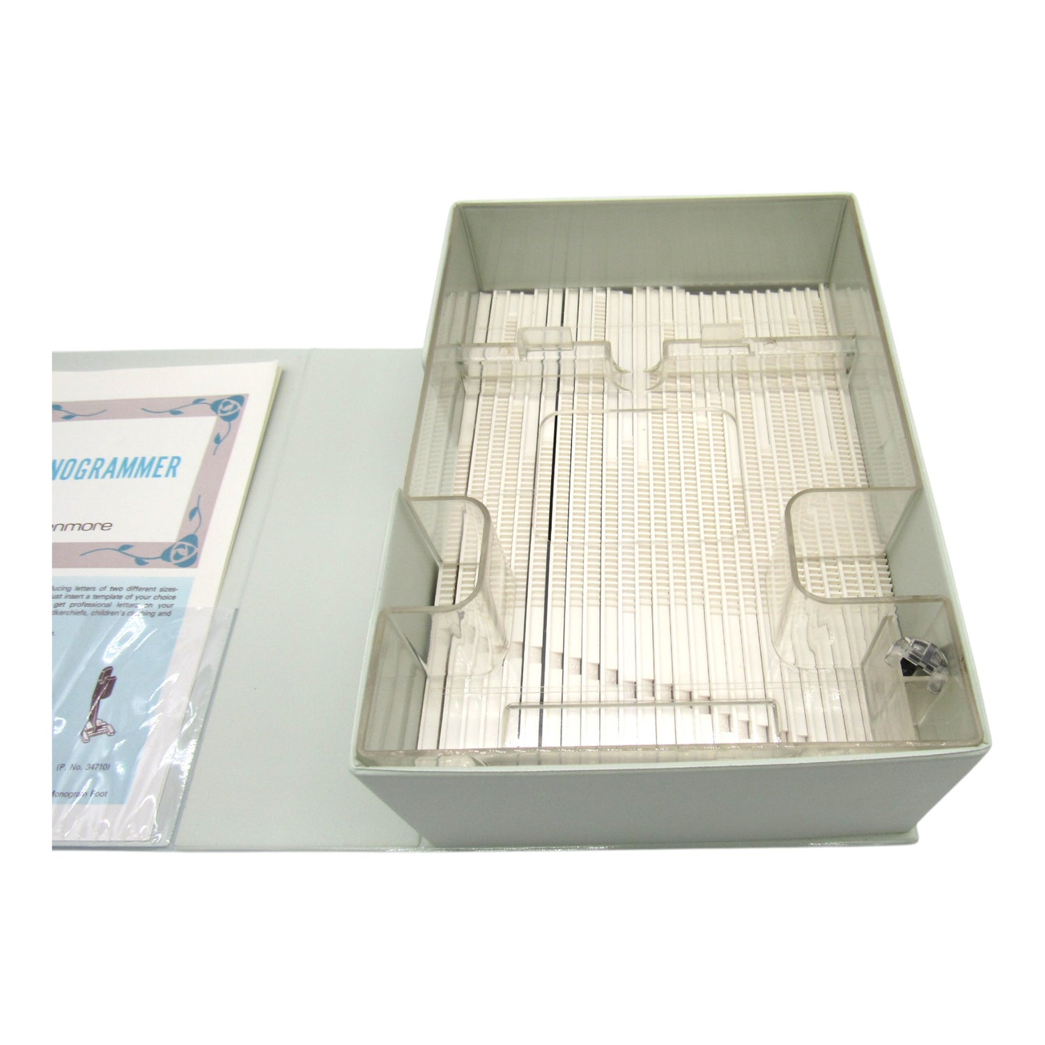 Add a personal touch to your sewing projects with beautiful, professional monograms. Whether you're creating custom linens for your home, personalizing gifts, or adding elegant initials to clothing, this monogrammer delivers crisp, clean lettering every time. The never-used condition makes this a true collector's piece and a functional treasure for any vintage sewing enthusiast.